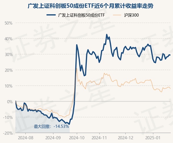 本站消息,1月22日,广发上证科创板50成份ETF最新单位净值为0.6218元,累计净值为0.6218元,较前一交易日下跌0.1%。历史数据显示该基金近1个月下跌3.57%,近3个月下跌1.11%,近6个月上涨29.41%,近1年上涨31.24%。该基金近6个月的累计收益率走势如下图: